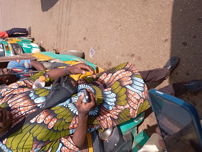 The image depicts an outdoor scene on a sunlit street or transport hub in Jos, Nigeria, featuring multiple individuals and tricycles. In the foreground, a dark-skinned male subject is partially visible from the chest down. He wears a short-sleeved, patterned tunic featuring green, orange-brown, and light blue organic shapes on a dark background, dark trousers, and dark slip-on shoes. A black crossbody bag with an orange-capped clear plastic bottle tucked into its strap is worn across his right shoulder. His hands are clasped, holding a black smartphone with a visible silver home button. A dark bracelet is present on his left wrist. In the mid-ground, a line of light green and yellow tricycles (keke napep) is visible. The closest tricycle has a green body and yellow trim; a white "PT" decal is visible on its side. Another dark-skinned male, wearing a blue patterned shirt, is seated within the passenger area of the second tricycle in the line. A third figure in a red shirt is partially visible standing further down the line of tricycles. The ground is a light brown, possibly asphalt or packed dirt, with scattered small debris and shadows indicating overhead sunlight.