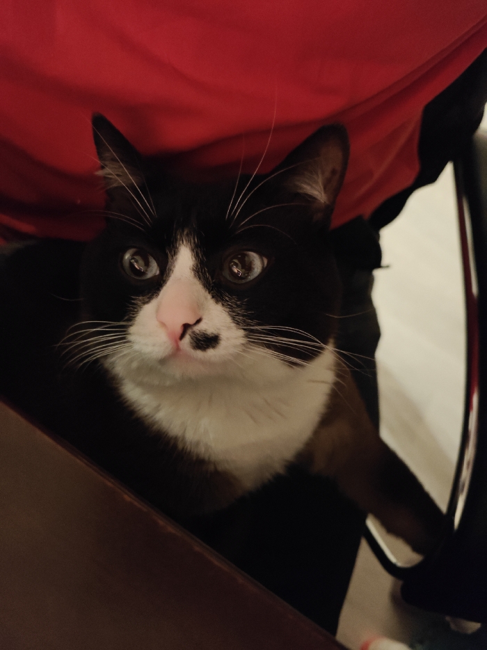 - "A black and white cat with a pink nose and a black spot on its face sits under a red fabric" by FM-eMutn2, licensed under CC BY 4.0