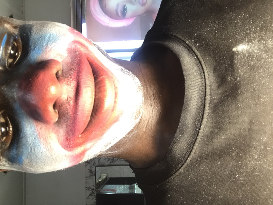 The image presents a close-up, chest-up view of an individual located in Narayi, Nigeria, positioned directly facing the viewer. The person, with dark skin visible on the neck and parts of the forehead, has their face covered in detailed clown makeup. This makeup includes a white base, a pronounced rounded red nose, extended red lips forming a wide, upward-curved smile, and blue eyeshadow applied above the eyelids. The individual is wearing a black crew-neck shirt, which is noticeably dusted with white powdery residue, consistent with makeup application. In the blurred background to the left, a mirror with a patterned frame is partially visible. To the right, a brightly illuminated television screen or digital display shows the lower right portion of another person's face, likely a female, characterized by prominent makeup and a pink headwrap. The overall scene suggests an indoor environment with direct, bright lighting.