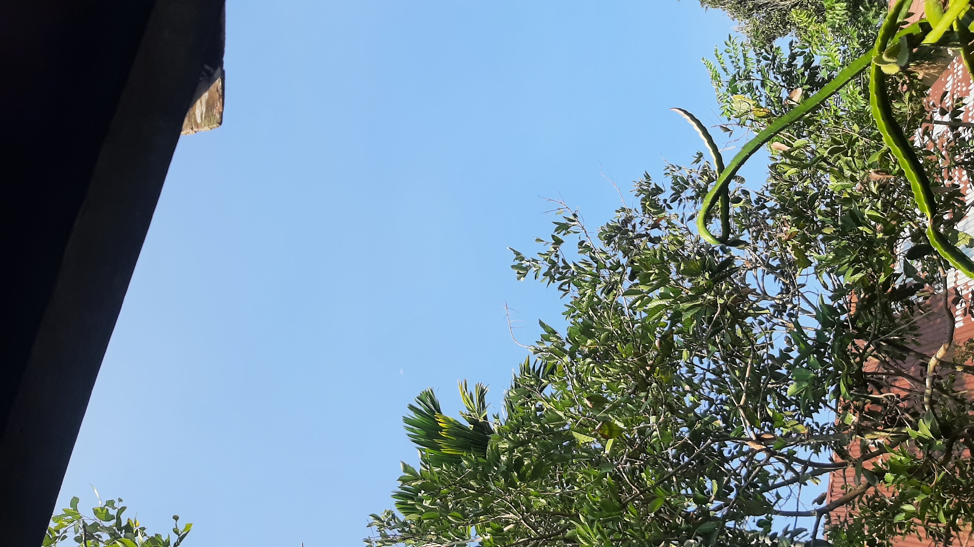 The image depicts an outdoor scene in Lhokseumawe, Indonesia, under a clear, bright blue sky. A dark, angled structure, consistent with a roof overhang or beam, partially occupies the upper edge and top right corner of the frame. A small section of reddish-brown brickwork is visible directly beneath this dark structure in the far upper right. Dominating the lower and mid-sections of the image is dense green foliage from various trees and plants. A large tree with numerous green leaves and visible branches fills the left and central mid-ground. To the left, a palm-like plant with distinct fronds is identifiable. A faint, crescent-shaped moon is discernible in the clear sky in the upper left quadrant. In the lower right foreground, a thick, segmented, green plant stem, characteristic of a dragon fruit plant (Hylocereus), curves upwards and across the frame; one of its upper segments appears split or open at its tip. Partially visible through the foliage in the lower background are sections of reddish-brown corrugated metal roofing. No individuals or active interactions are depicted.