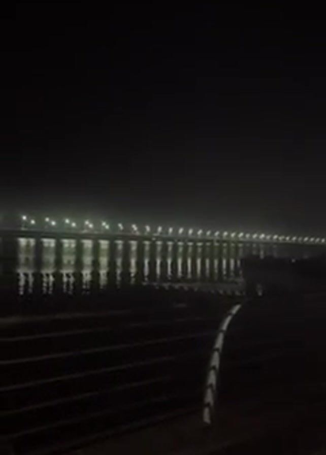 long bridge at night. The bridge is lined with lights that reflect in the water below. A black railing is visible in the foreground. There are no visible people.