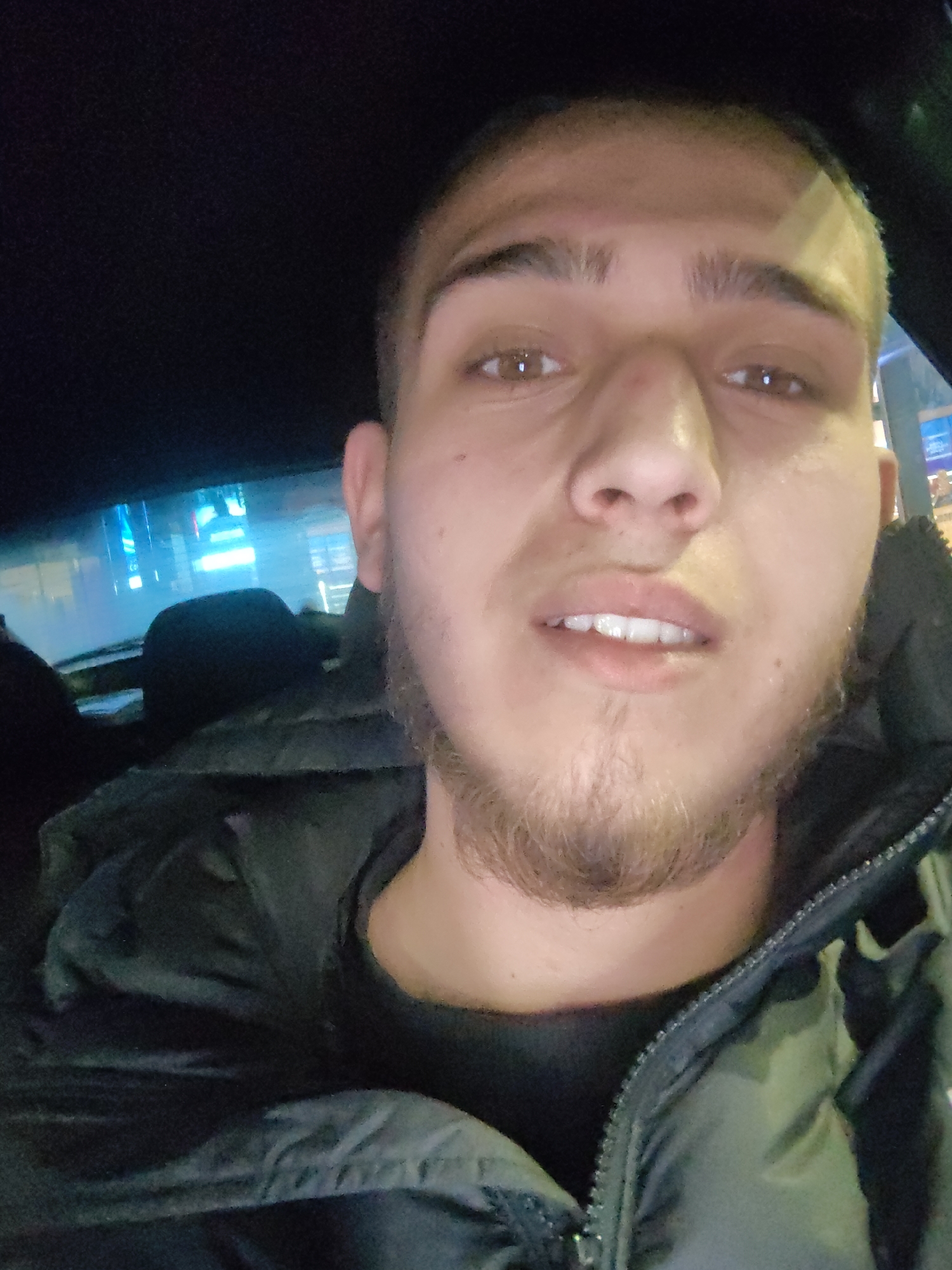 - "A medium close-up photograph shows a young man with light brown skin, short hair, and a patchy beard, sitting inside a vehicle, possibly a car, at night" by FM-tUUBK2, licensed under CC BY 4.0