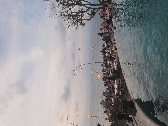 The image depicts an outdoor dining establishment with an infinity pool overlooking a body of water, likely the Indian Ocean, in Pecatu, Indonesia. The scene is illuminated by twilight conditions under an overcast sky, with artificial lighting contributing to the ambiance. In the foreground, an infinity pool occupies the lower right and center, reflecting the sky and ambient light. Its concrete edge runs along the left, featuring a dark seated statue and a large potted plant. Beyond the pool and on a terraced level, numerous white-clothed dining tables with accompanying chairs are arranged. Each table appears set with tableware. Approximately 40-60 individuals are present, predominantly seated at the tables, engaged in dining and social interaction. Several people, possibly staff, are observed standing and moving among the tables. Tall, arc-shaped lampposts, each topped with a glowing spherical yellow lantern, are strategically positioned throughout the dining area, providing illumination. Smaller hanging lights are also visible. A large, gnarled tree with sparse foliage stands on the far right, near the dining area. The ocean extends to the horizon in the background under the diffused light of the sky.