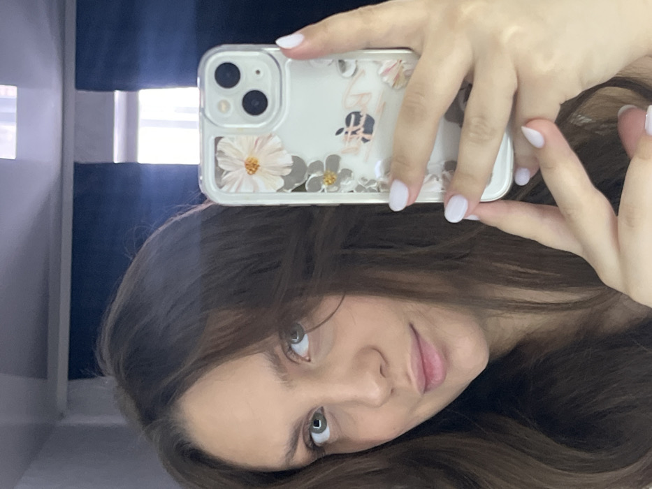 The image captures a mirror selfie of a female individual in an indoor setting within the city of Chaikovsky, Russia. The woman, possessing long, wavy dark brown hair and light green eyes, faces the reflective surface with a neutral expression and a slight smile. She holds a white-framed smartphone, specifically an iPhone with dual camera lenses, in her right hand. The phone is encased in a transparent cover featuring white and gold floral designs and a partially visible Apple logo. Her fingernails are manicured with a light, likely white or pale pink, polish. The reflected background reveals a dark blue wall or curtain behind the woman's head and a bright, vertical rectangular light source, consistent with a window or interior fixture, positioned above the phone. A thin white horizontal strip is visible above the light source.