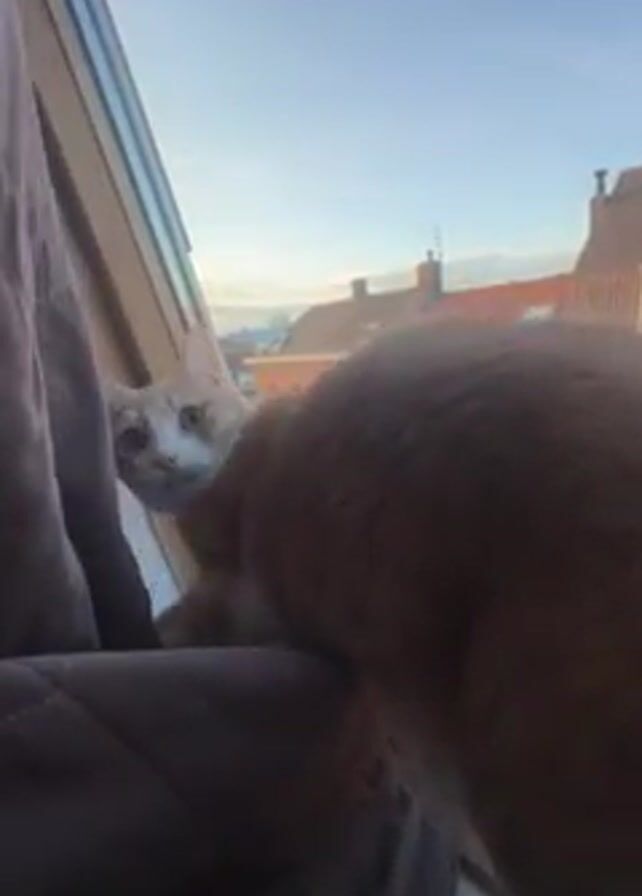 n orange and white cat standing on a padded cushion near a window, looking outside. The cat is positioned close to a dark purple curtain. The window offers a view of a street with buildings, rooftops, and a blue sky with some clouds. A hand appears briefly, touching the cat’s back. The scene is brightly lit by natural light, creating a clear view of the exterior. The camera position is stable, offering a close-up perspective of the cat and its surroundings.
