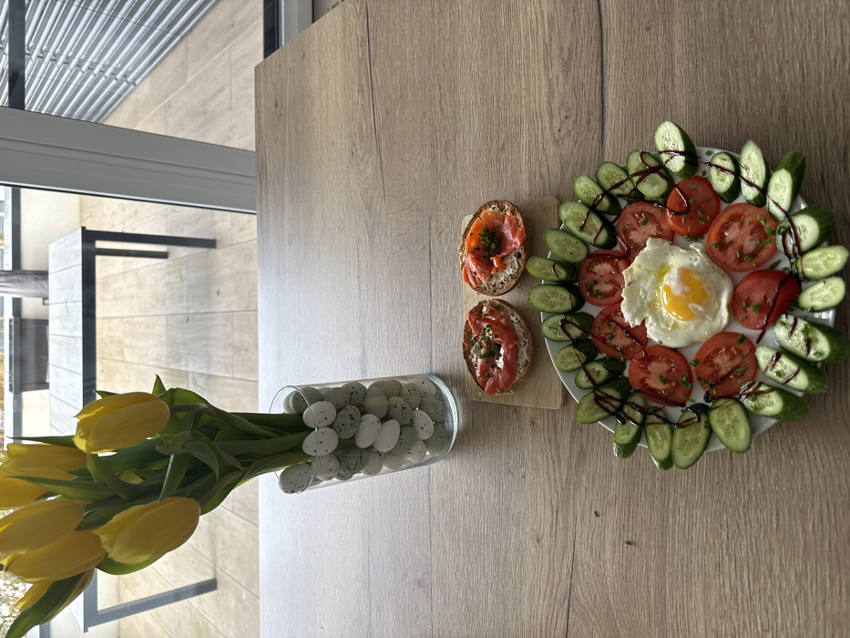 An indoor scene in Pétange, Luxembourg, presents a breakfast arrangement on a light brown wooden table. In the upper left quadrant, a clear cylindrical glass vase holds a bouquet of yellow tulips, its base filled with speckled white and light green decorative egg-shaped items. Through a large window or glass door in the background, a light-colored tiled outdoor patio is visible, featuring a dark rectangular outdoor table with a dark frame. On the wooden table in the middle ground, a small rectangular wooden cutting board displays two bagel halves, each topped with cream cheese, smoked salmon, and finely chopped chives. A round white plate in the foreground holds a meal composed of a centrally placed fried egg with a fully cooked white and a visible yolk, surrounded by radially arranged slices of red tomatoes. These tomatoes are further bordered by an outer ring of sliced green cucumbers. A dark, viscous balsamic glaze is decoratively drizzled over some of the cucumber and tomato slices, and additional finely chopped green herbs are present on the tomatoes and egg.