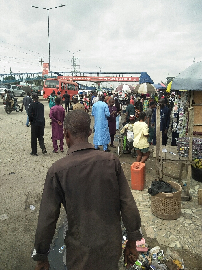 - "The image captures a bustling outdoor market and roadside scene in Ajah, Nigeria, specifically near the Abraham Salewa and VET, 3rd HFP Complex, Block F3, as indicated by signage on an elevated pedestrian bridge" by FM-YhEN42, licensed under CC BY 4.0