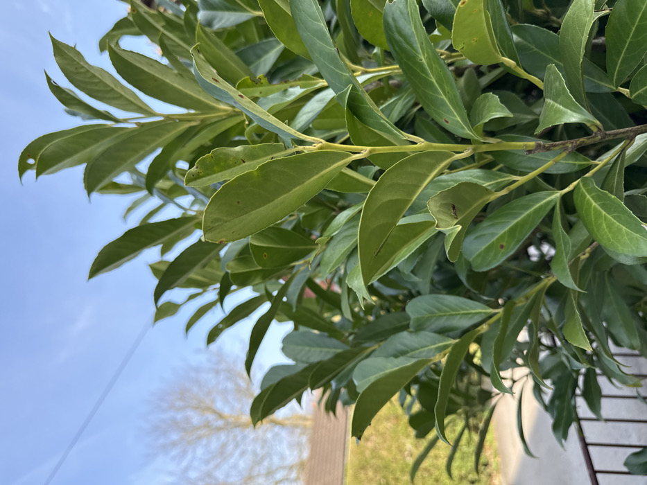 - "The image depicts a dense evergreen shrub, likely a cherry laurel, primarily filling the foreground and midground under a clear light blue sky" by FM-3Gg9C3, licensed under CC BY 4.0