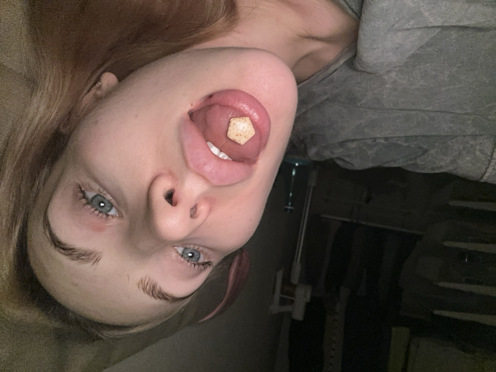 A young woman with blue eyes is holding a tan square object on her tongue. She is wearing a gray sweatshirt and has blonde hair. The camera is angled up, looking at her from below, and the image is rotated. The background is dark and cluttered with a clothing rack.