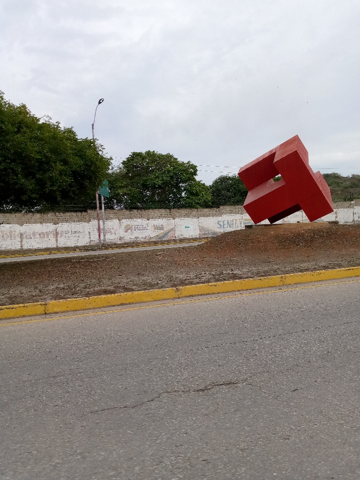 A red, geometric sculpture sits atop a brown mound in a roundabout near a road with a yellow curb. A white wall with faded advertisements runs behind the roundabout, bordering a green tree line. A lamppost rises from the left side of the frame. The sky is overcast. The road surface shows cracks and wear.