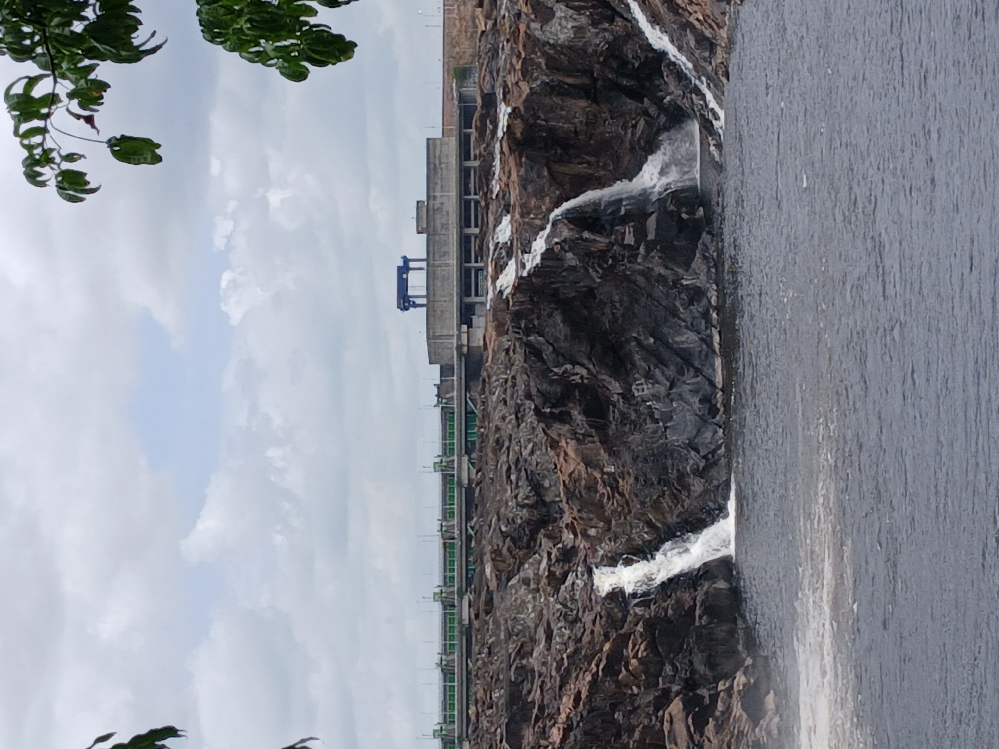 A towering rock face with cascading waterfalls dominates the scene. Next to it is a body of water. A concrete structure, potentially a dam or industrial building, is perched atop the rock. A bridge or walkway runs alongside the structure. The sky is cloudy. Foliage is visible in the upper left corner, framing the shot. The image is oriented sideways.