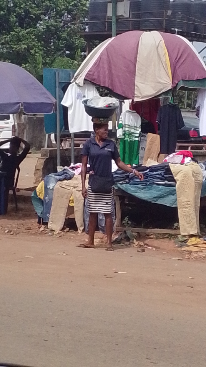 The scene depicts an outdoor street market or vending area in Igbo Ukwu, Nigeria. In the foreground, an adult woman stands slightly right of center, facing right. She wears a dark blue polo shirt, a black and white horizontal striped skirt, and light-colored flip-flops, with a black fanny pack strapped across her torso. A black basin containing items, including a white plastic bag, is balanced on her head. Her left hand rests on a pile of folded clothing displayed on a wooden table covered by a greenish-blue tarpaulin. Behind her and to her right, a large market umbrella with alternating dark red, beige, and green sections provides shade over additional clothing displays. Various shirts are hanging from the umbrella's structure and a stand behind it, including white t-shirts and a green and white striped shirt. To the woman's right, more folded clothes, including a pair of light brown pants with an embossed pattern, are visible on another draped table. On the far left, partially obscured by a blue market umbrella, another individual sits on a dark chair with their hands behind their head. The ground is unpaved dirt. In the background, green foliage is visible, along with concrete structures and multiple dark water tanks elevated on a platform. A portion of a white vehicle is also visible on the far left.