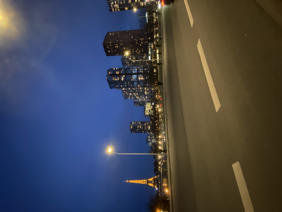 At dusk, the Eiffel Tower glows below a street lamp. Modern buildings with illuminated windows rise above it, appearing as stacked blocks in the background. An asphalt road with white lane markings runs along the right side of the frame. The sky is a deep blue.
