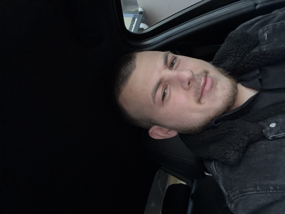 The image displays a male individual, estimated to be between 20 and 40 years old, positioned in the driver's seat of a vehicle. He has short, dark, closely-cropped hair and a light brown beard and mustache. A slight swelling is noted on the upper eyelid of his right eye (subject's right). He is dressed in a black collared shirt and a dark denim jacket with a black faux-shearling collar. The subject is looking directly at the camera with a subtle, closed-mouth smile. The vehicle's interior, including the headliner and visible seat components, is black. Through the passenger-side window, a light-colored building exterior is partially visible, indicating an outdoor, daylight environment. The precise location within Malevo, Bulgaria, cannot be determined from the visual content provided.