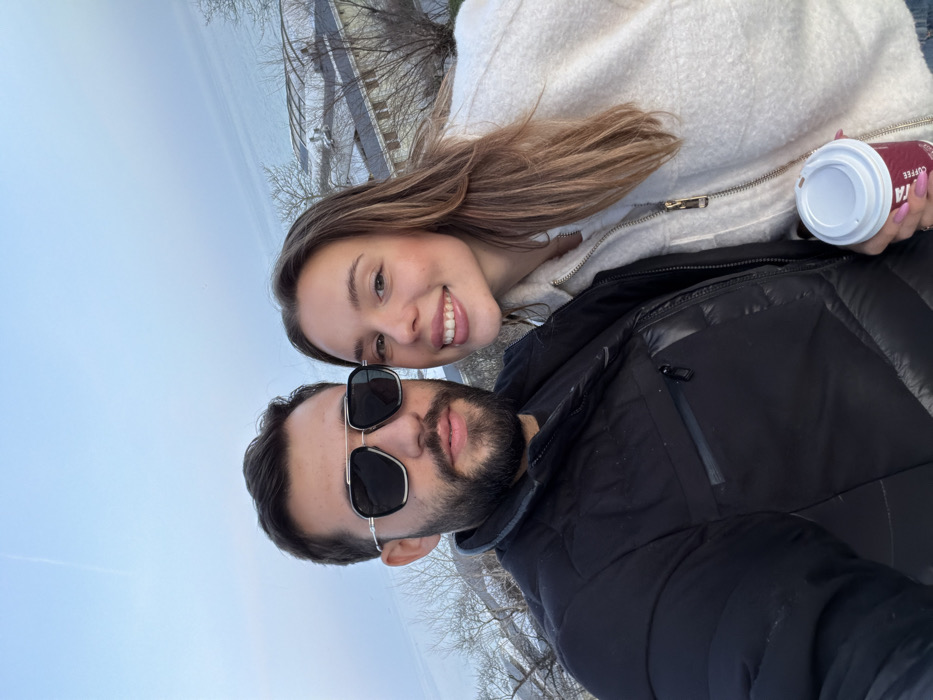 The image displays two individuals, a male and a female, captured in a close-up selfie format, overlooking the Black Sea from an elevated position in Varna, Bulgaria. The male, positioned on the left, has dark hair and a beard, wearing dark square-framed aviator-style sunglasses with a silver-colored double bridge. He is dressed in a black quilted puffer jacket featuring a textured chest panel with a zippered pocket. His facial expression shows a faint smile. The female, positioned on the right and slightly closer to the camera, has long, light brown hair. She is smiling broadly, revealing her teeth. Her attire consists of a cream-colored, textured, zip-up jacket worn over a lighter inner layer. Her left hand, with pink-painted fingernails, holds a red paper coffee cup with a white lid, displaying the "COSTA" logo. The background features a pale blue sky above a calm, expansive body of water, consistent with the Black Sea. Below the horizon line, on the distant shore or at a lower elevation, are several multi-story buildings with angled roofs and sparse, bare deciduous trees, indicative of a cooler season. The perspective suggests the photograph was taken from a hillside or high ground overlooking the coastal urban environment of Varna.