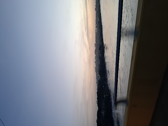 The photo shows a body of water under a twilight sky, with hints of orange and pink near the horizon. Along the shoreline, a city skyline is faintly visible with its scattered lights. A barrier or railing runs vertically along the right side, adding perspective. The scene evokes tranquility and the transition between day and night.