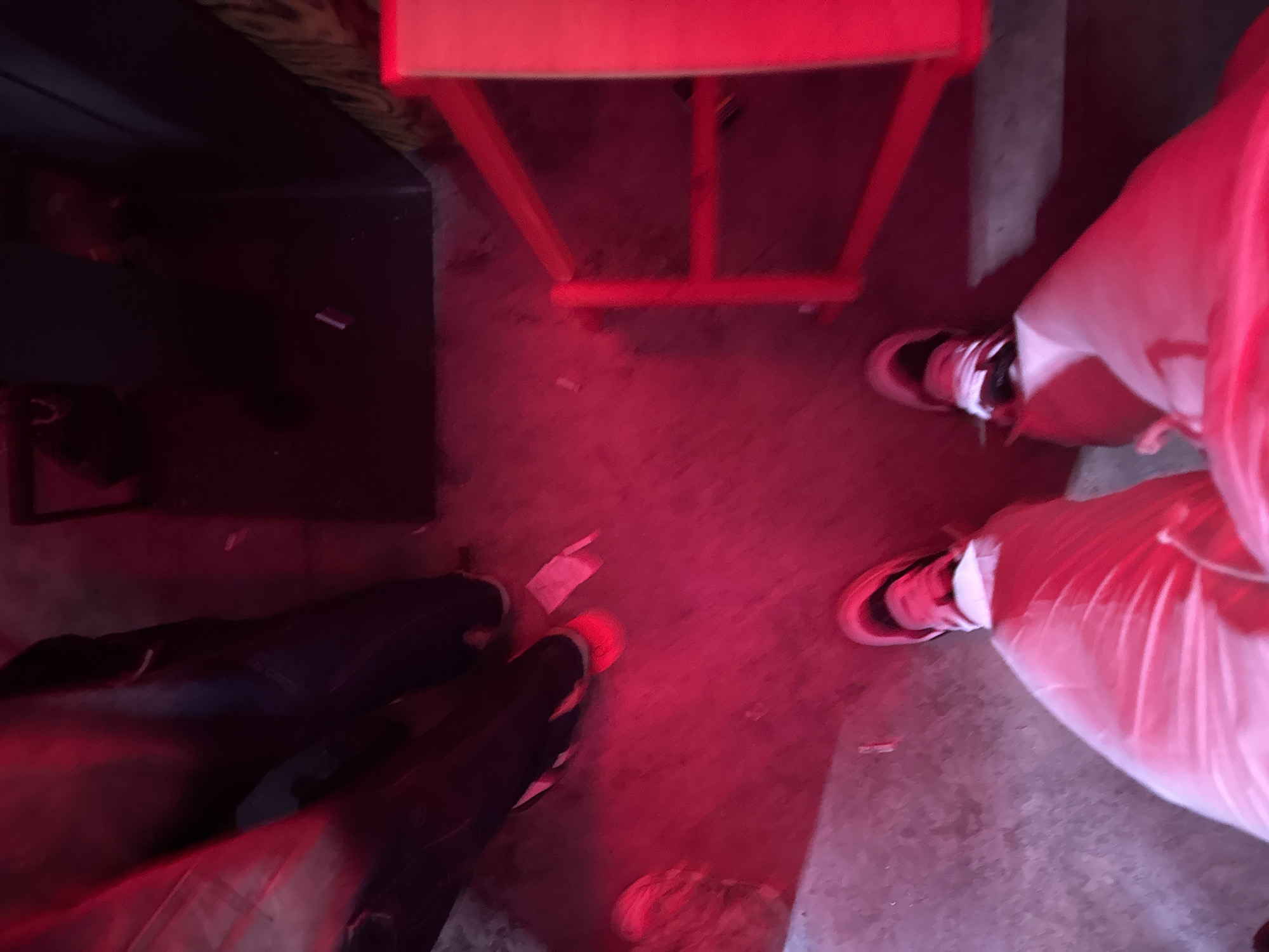 n overhead view of a room bathed in red light. Two people are visible from the knees down. One person is wearing dark pants and dark shoes. The other person is wearing light-colored pants and light-colored shoes. Between the two people is a red metal table. The background of the room is dark and cluttered. It is difficult to determine the exact location in Sofia, Bulgaria based on this image alone.