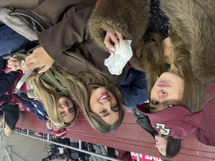 Three women sit in a stadium. The woman on the left wears a green jacket, the woman in the middle wears a brown coat, and the woman on the right wears a brown fur jacket and a maroon baseball cap with a logo. They appear to be watching an event. The seats are red, and other spectators are visible in the background.