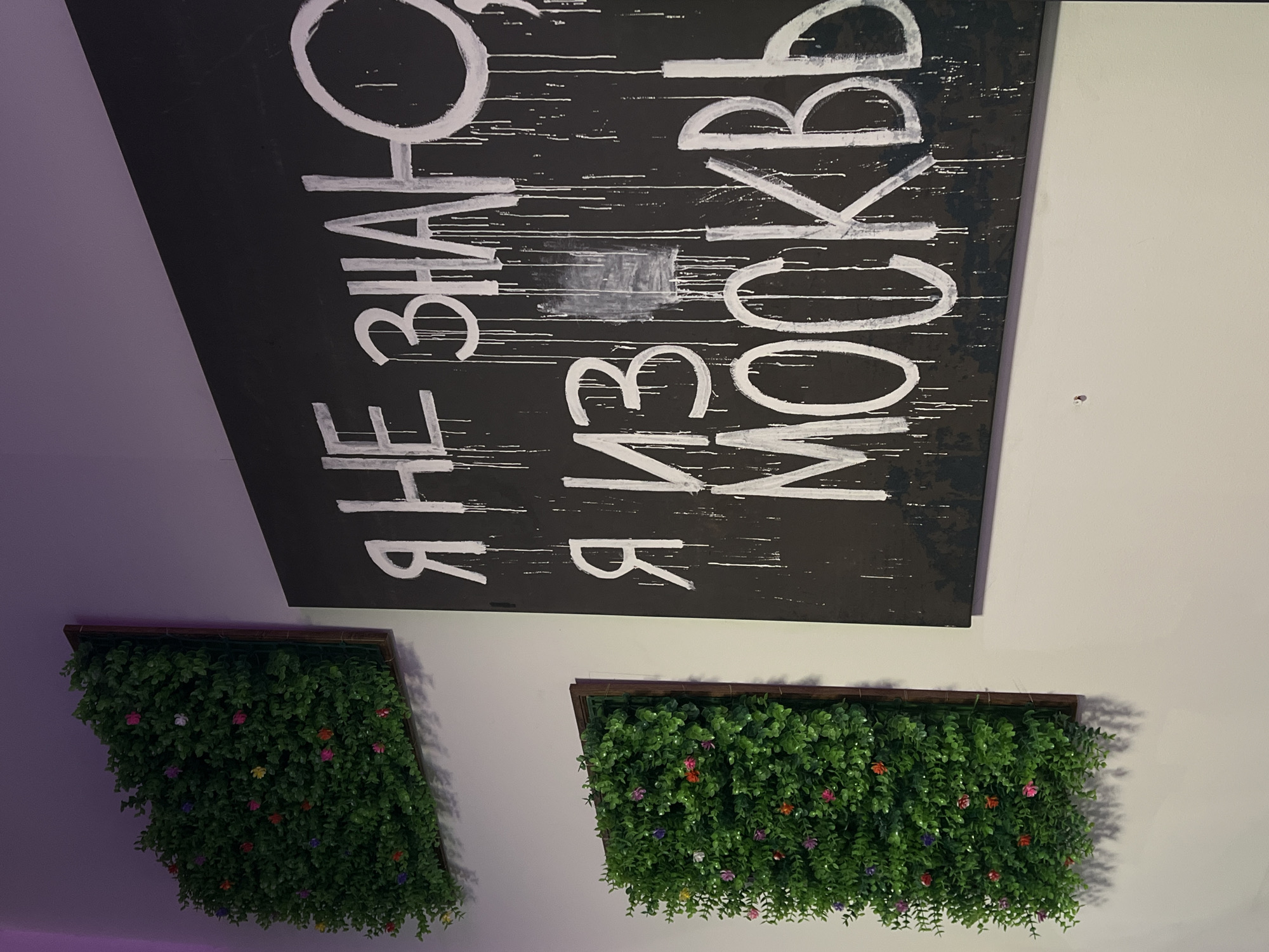wall with a black rectangular sign bearing white Cyrillic text "Я НЕ ЗНАЮ Я ИЗ МОСКВЫ" (I don't know, I'm from Moscow), placed above two rectangular faux-greenery patches with small, colorful faux-flowers