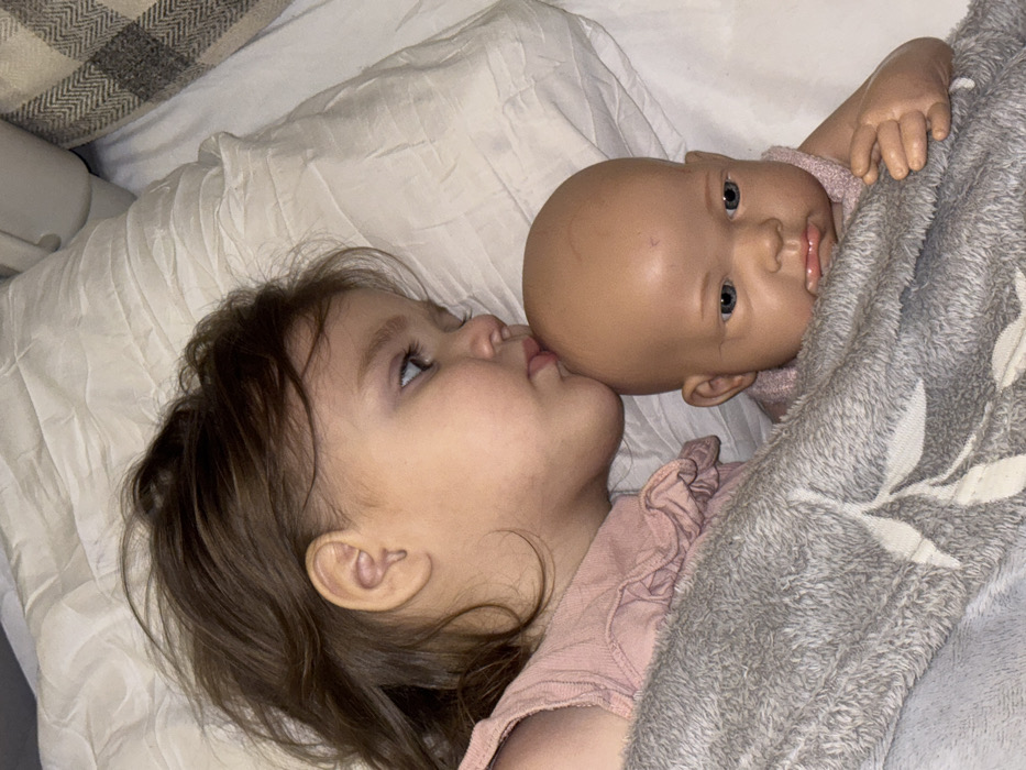 An image taken in Chaikovsky, Russia, depicts a young child, appearing to be female, lying on their left side on a bed. The child has brown hair and light skin, and is wearing a pink, ruffled sleeveless top. Their lips are pressed against the forehead of a baby doll, which has a light skin tone, a bald head, and blue eyes. The doll is partially covered by a gray blanket featuring a white leaf pattern, as is the child's lower body. The child's right arm is obscured by the blanket, while the doll's right hand is visible resting on the blanket. The bed is covered with wrinkled light-colored sheets or a duvet, and a pillow with a light gray and white plaid pattern is visible in the upper right background.