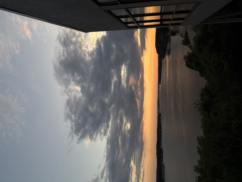 The image depicts a sunset over Lake Ozark, United States, viewed from an elevated position. The sky transitions from light grey-blue at the top to vibrant orange and yellow hues along the western horizon. Dark, textured clouds cover the central and upper portions of the sky, with lighter sky visible through breaks. Below the horizon, the expansive, dark surface of Lake Ozark occupies the middle ground, exhibiting subtle ripples. Distant shorelines are visible on both the left and right sides of the lake; the left shore shows indistinct residential or commercial structures, while the right shore is densely forested. The immediate foreground is dominated by dark green foliage, indicating trees or bushes. A modern building, characterized by a flat, dark grey exterior wall and large, multi-paned windows reflecting the sky and water, occupies the right side of the frame. No individuals, specific actions, or interactions are discernible.