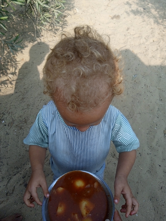 - "An overhead photograph depicts a young child holding a metal bowl filled with food on sandy ground in Khan Yunis, Unknown" by FM-cV3b62, licensed under CC BY 4.0