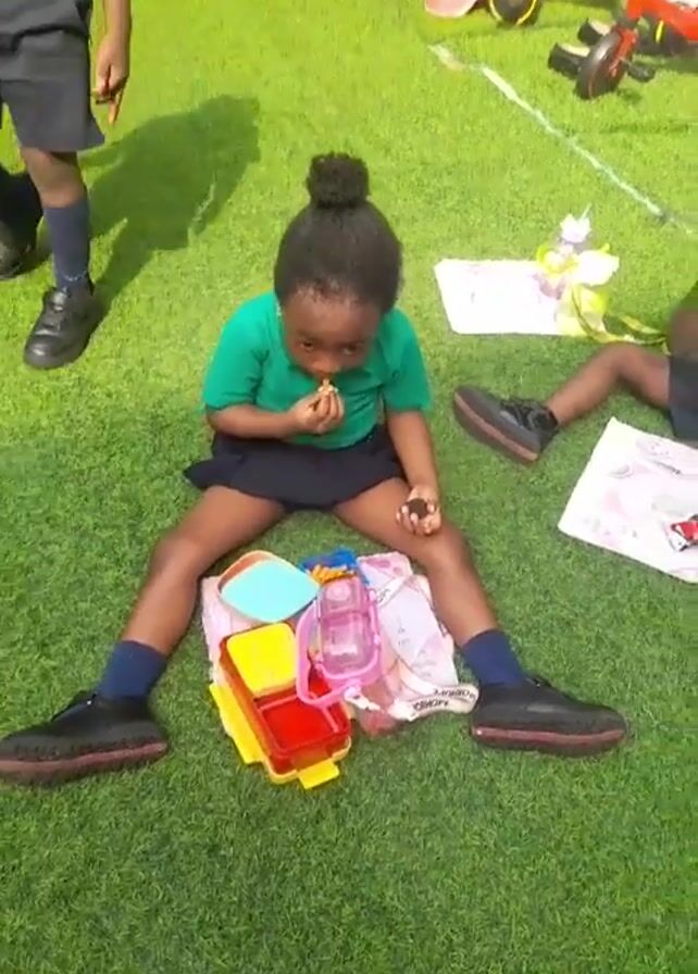 A young black girl is sitting on a green astroturf lawn, eating something out of her hand. She is wearing a green polo shirt, a navy blue skirt, blue socks, and black shoes. Her hair is styled in a bun on top of her head. She has a lunch bag and several containers spread out in front of her. Around her are other children, bikes, and what appears to be playground equipment. Several adults are also visible.