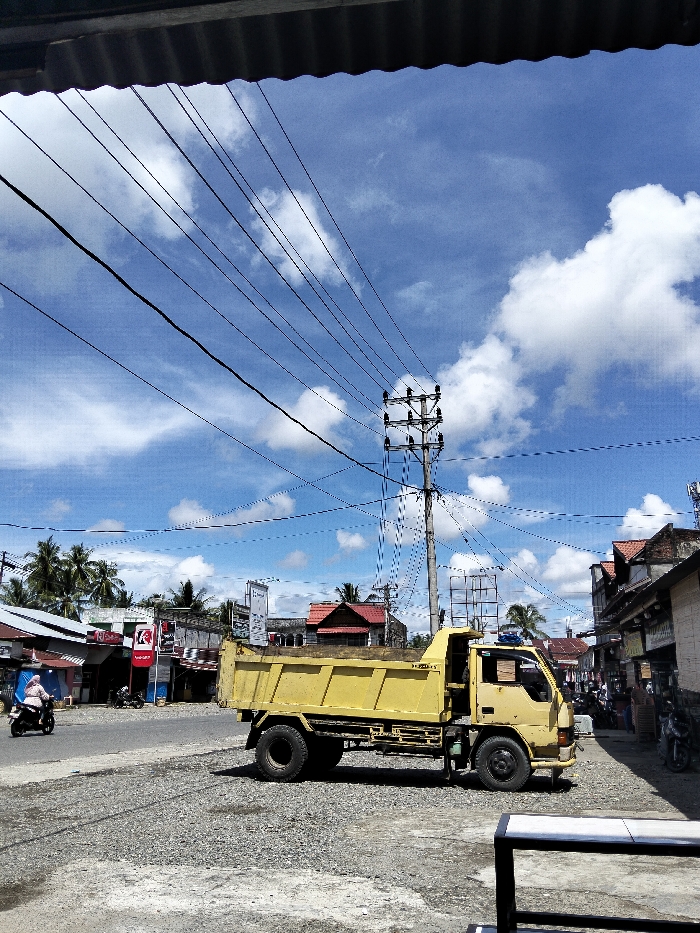 A yellow dump truck sits parked on a gravelly area next to a street with shops and houses. Utility lines crisscross the clear blue sky with fluffy white clouds above the truck. A utility pole is directly behind the vehicle. A person on a scooter rides on the street. A partial view of a corrugated roof overhang is visible at the top of the frame.