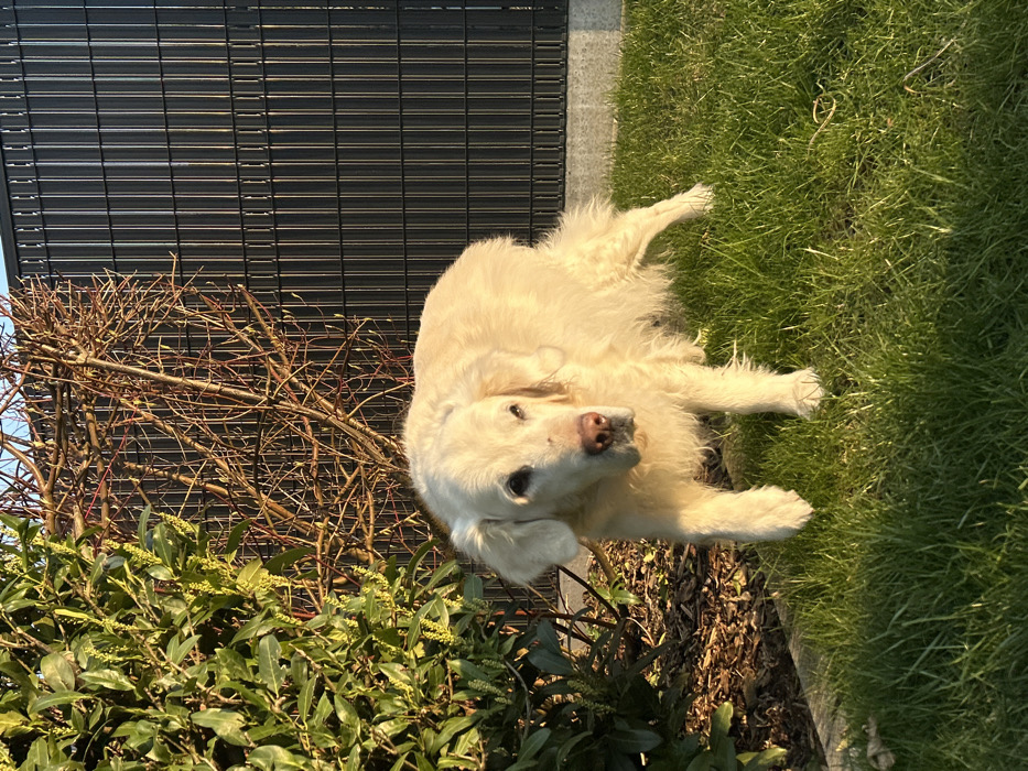 - "This image, captured in Truchtersheim, France, features a light cream-colored Golden Retriever dog standing on green grass" by FM-dAK2v2, licensed under CC BY 4.0