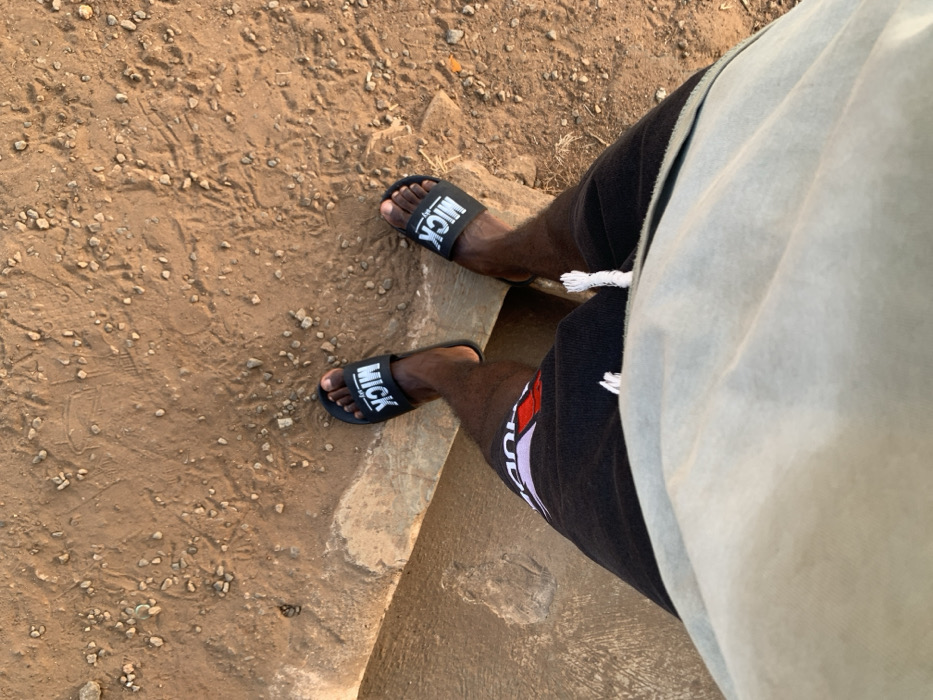A person stands on a concrete step, feet adorned in black sandals with "MICK" printed on the straps. The ground to the left is brown dirt, dotted with small rocks and markings. The individual wears black shorts with a white drawstring and what appears to be white writing on the side, a light green overshirt covers the right side.