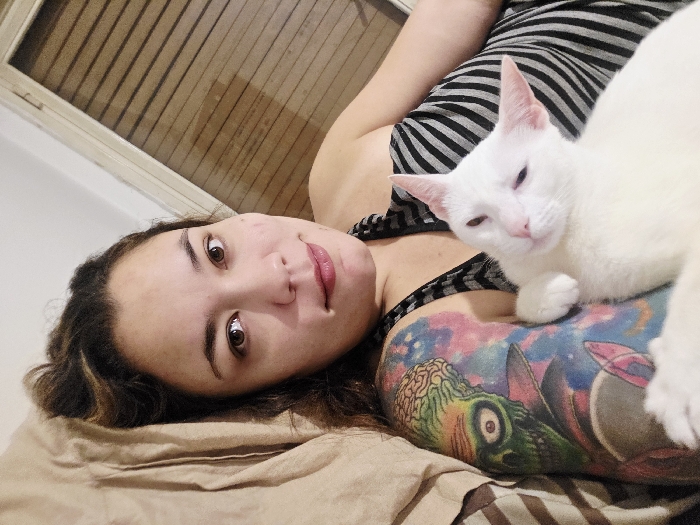 A person reclines on bedding, gazing at the camera. A white cat rests on the person's shoulder and arm. A detailed, colorful tattoo is visible on the person's upper arm. The person has brown eyes, dark hair, and fair skin. The person is wearing a black and white striped top. The background shows a window with closed blinds. The lighting is warm and slightly muted.