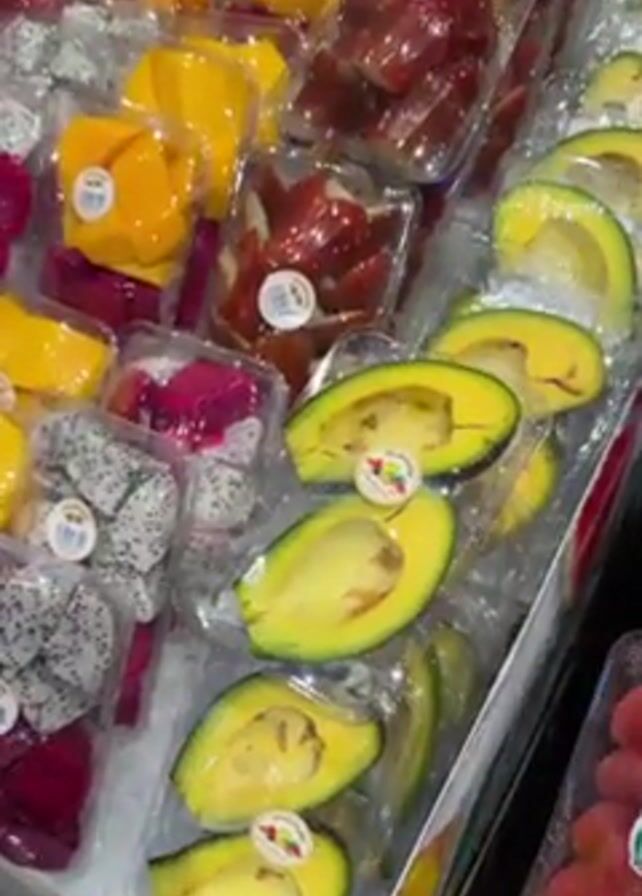 The camera pans over a refrigerated display case full of pre-cut and packaged fruits. These include avocado halves, mango chunks, dragon fruit chunks of both white and pink flesh, and other red-fleshed fruits. The fruits are arranged in clear plastic containers. The display case appears to have ice around the containers, keeping the fruit cool.