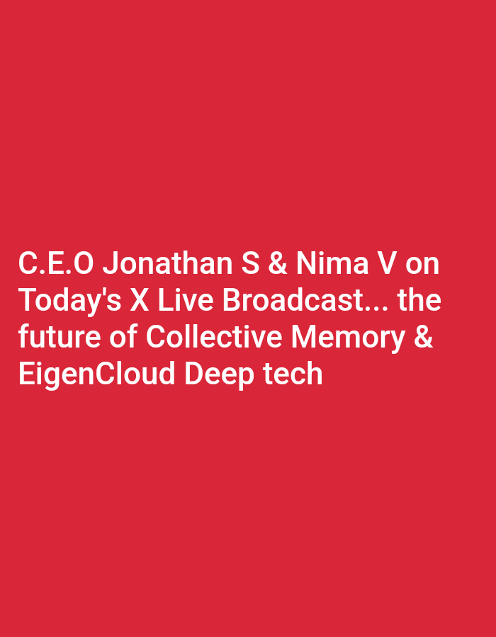 The image displays a solid red background with white sans-serif text centered horizontally. The text reads: "C.E.O Jonathan S & Nima V on Today's X Live Broadcast... the future of Collective Memory & EigenCloud Deep tech". There is no visual depiction of a city, a specific location in Moshi, Tanzania, nor any people, physical subjects, objects, actions, interactions, or environmental features.
