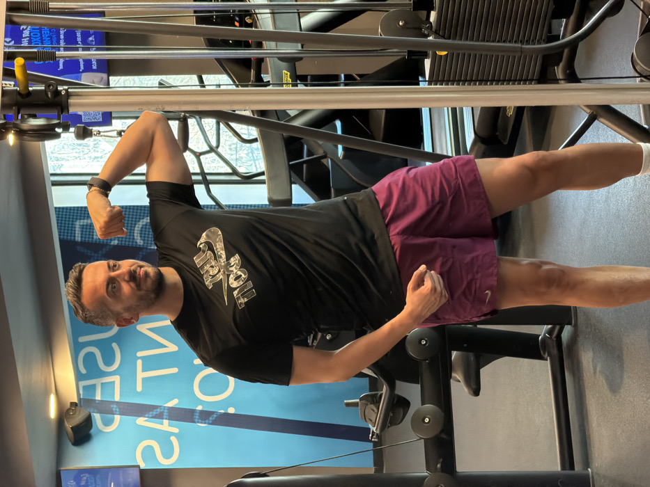 A male individual, appearing to be in his late 20s to early 40s, stands inside a modern fitness center