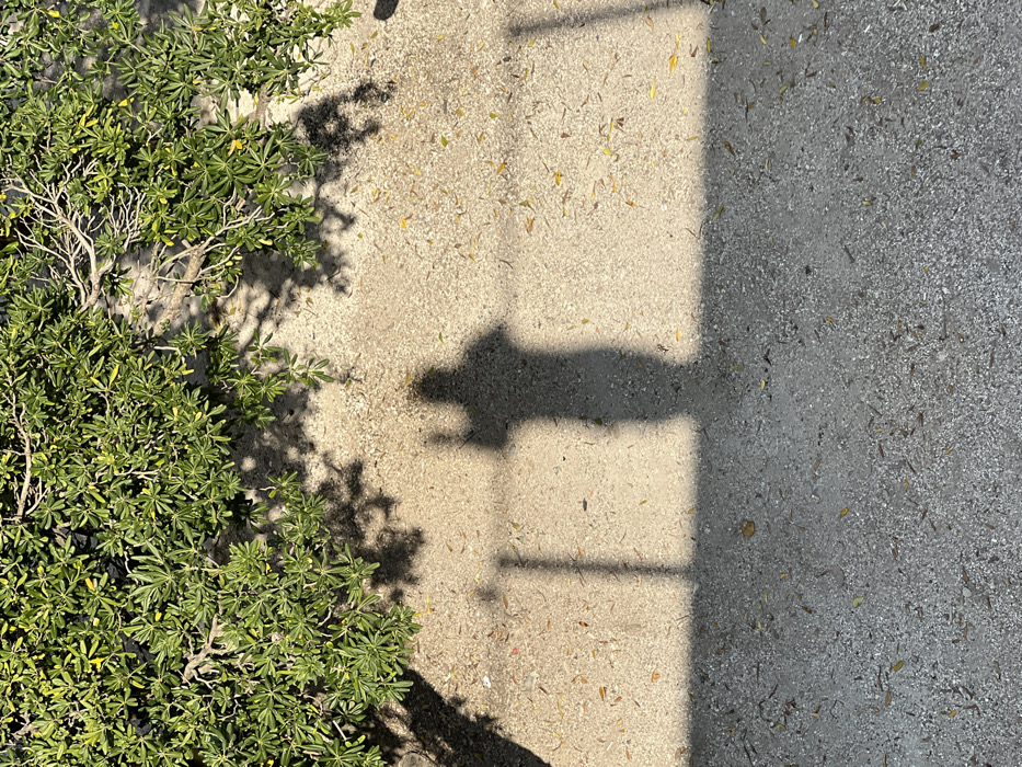 An overhead view captures a sunlit outdoor scene in Bogdašići, Montenegro. The upper third of the frame shows dense green foliage from a bush or tree, casting intricate shadows onto the ground below. The ground surface is a light-colored, gravel-like material, visibly scattered with small pebbles and yellowed leaf debris. Prominently featured in the lower half of the image is a dark, distinct human silhouette, cast by direct sunlight. The shadow depicts an individual standing upright, with one arm raised and bent at the elbow, suggestive of holding an object or making a gesture. To the left and right of the human shadow, two vertical rectangular shadows are present, extending upwards from a broad, sharp horizontal shadow that spans the bottom fifth of the frame. This horizontal shadow indicates a barrier or railing from which the perspective is taken, with the two vertical shadows likely originating from posts or supports.