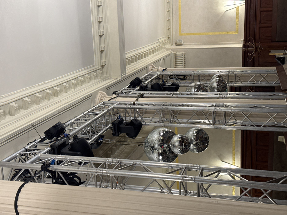 The image displays an indoor venue featuring stage lighting trusses and disco balls. The trusses, constructed of silver metal, support stage lights and hang disco balls. The building features ornate white walls, molding, and gold accents. A dark wooden door is seen. The trusses are elevated and the camera is angled upwards to capture the lighting and ceiling details.