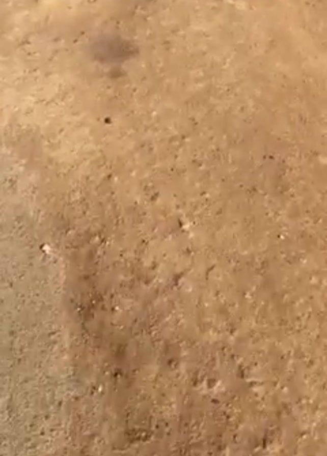 gray sedan driving along a paved road in what appears to be a rural or semi-rural area. The road is flanked by dirt shoulders and scattered debris. Buildings are visible on both sides of the road, some appearing to be residences and others potentially commercial establishments. The sky is clear and light blue, suggesting a sunny day. Power lines run overhead. There is minimal traffic, and no people are clearly visible. The car drives past, and the video ends.