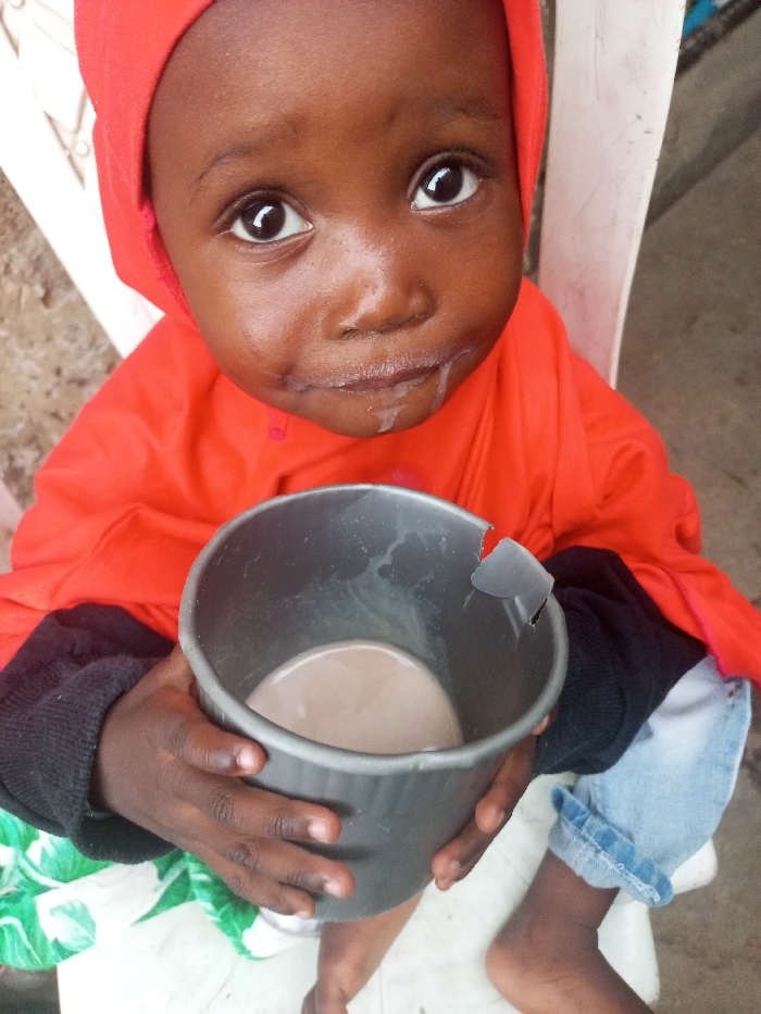 A young, dark-skinned child sits on a white chair, holding a gray, chipped cup containing a milky brown liquid