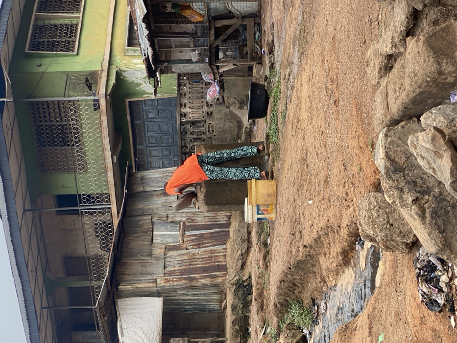 This image depicts an outdoor, unpaved residential area in Ibadan, Nigeria
