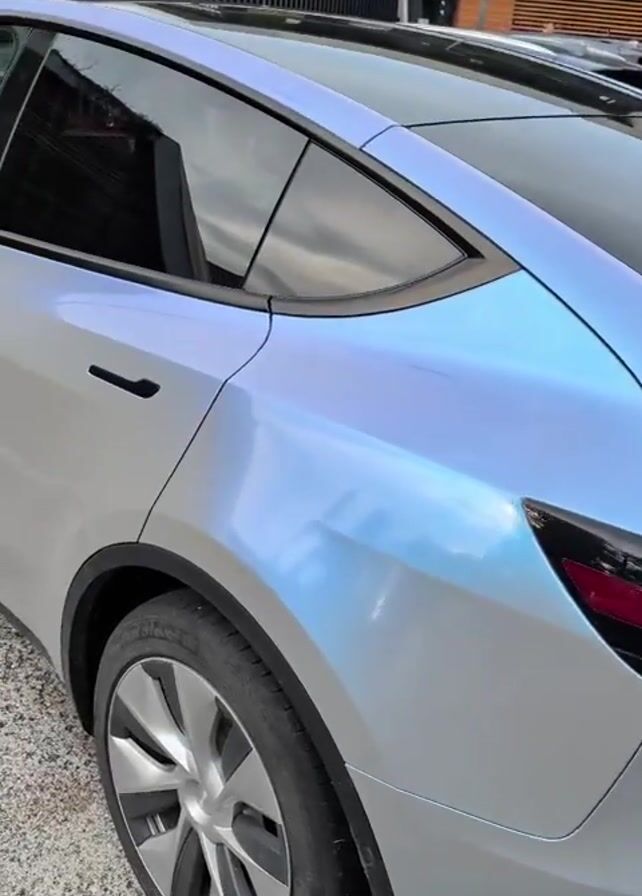 Tesla Model Y parked on a paved surface. The car has a light gray body with a blue iridescent sheen. The car is parked in front of a building with a black metal fence and a pedestrian sidewalk. The camera pans along the side of the car.
