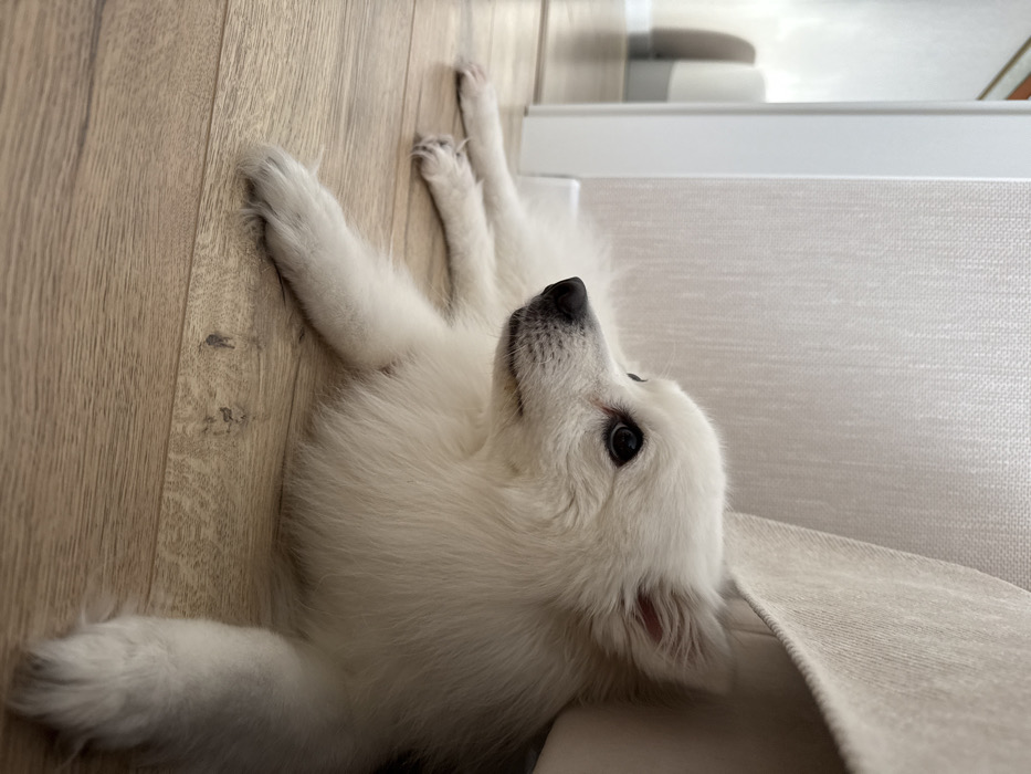 A small, white, fluffy canine, consistent with a Pomeranian or Japanese Spitz breed, is depicted resting prone on a light-colored wooden floor