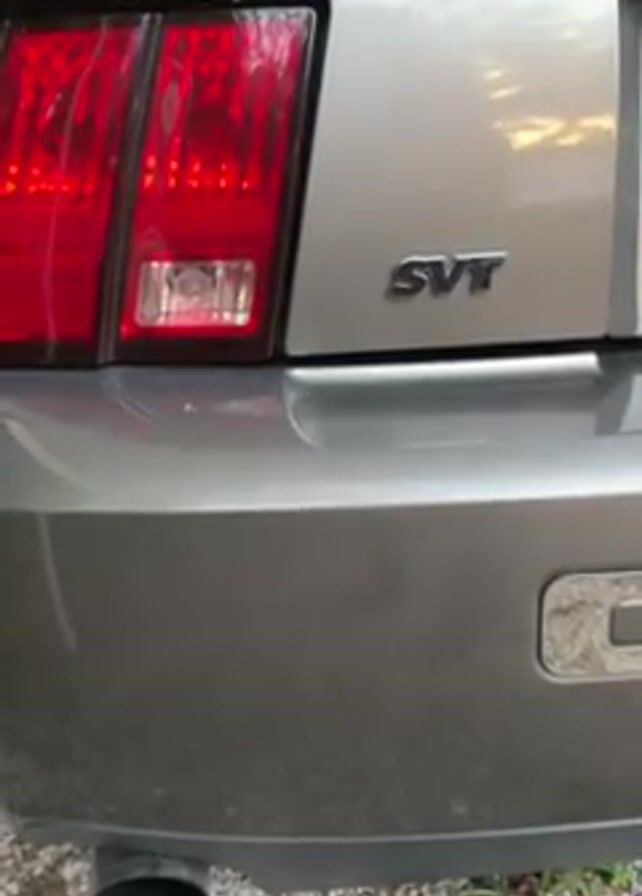 rear end of a gray Ford Mustang SVT, with its taillights, SVT badge, exhaust pipe, and a chrome gas cap visible. The car starts and the engine sound is audible. The car is outdoors, parked in what appears to be a driveway.