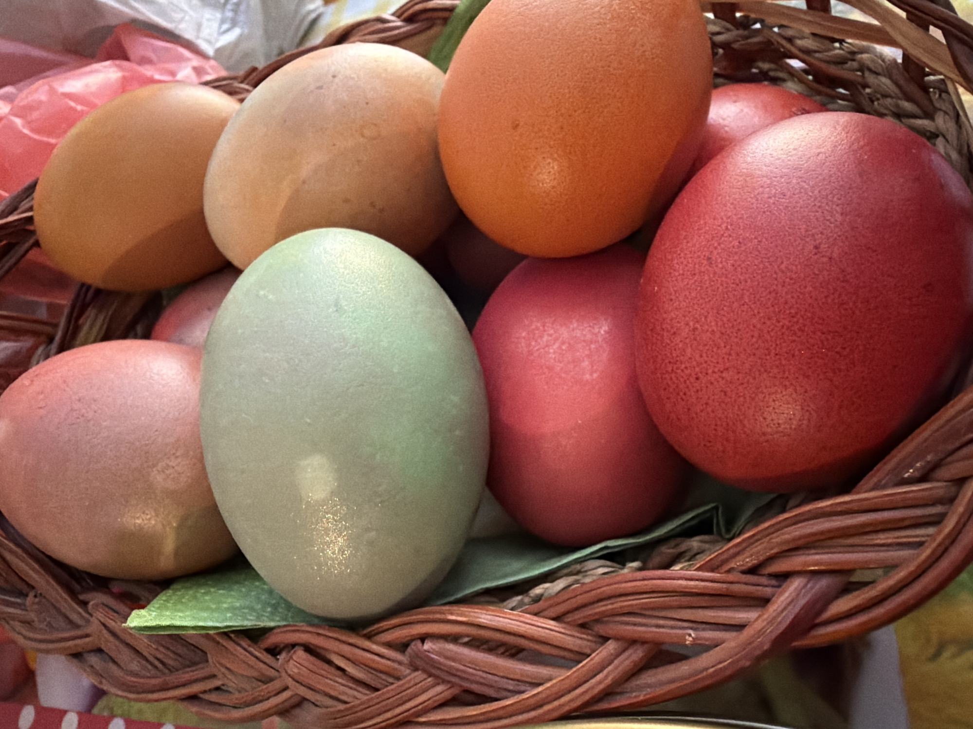 A basket of colored eggs sits on a surface
