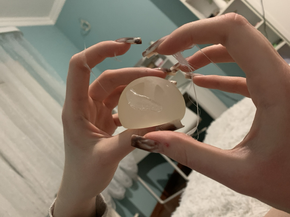 A translucent, hemispherical object with internal cavities is held between two hands with long, decorated nails. Thin, white filaments extend from the object and wrap around the fingers. The background includes a white surface and elements of a room, such as a light-blue wall, a window, and a white shelving unit. The lighting is soft and diffused.