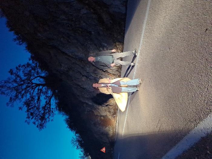 Two men stand on a road. One wears a green jacket and gray pants. The other wears a brown jacket and blue jeans. One carries a long, yellow object. To the left is a rock wall with a tree silhouetted against the blue evening sky. A road sign is at the bottom. The road is dark asphalt, with a solid white line.