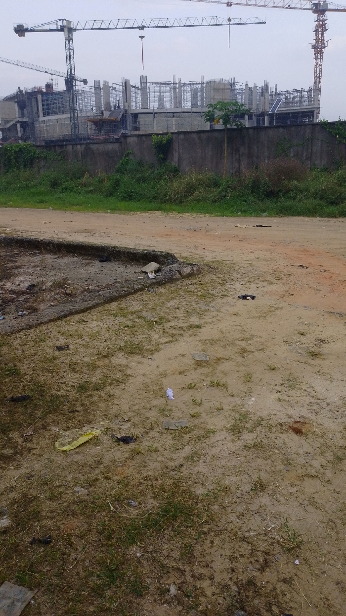 A construction site looms in the background, partially obscured by a concrete wall topped with sparse vegetation. Several cranes dominate the skyline above unfinished buildings. The foreground is a dirt patch with scattered debris, suggesting an unkempt or undeveloped area. The overall impression is one of active development juxtaposed against a neglected landscape.