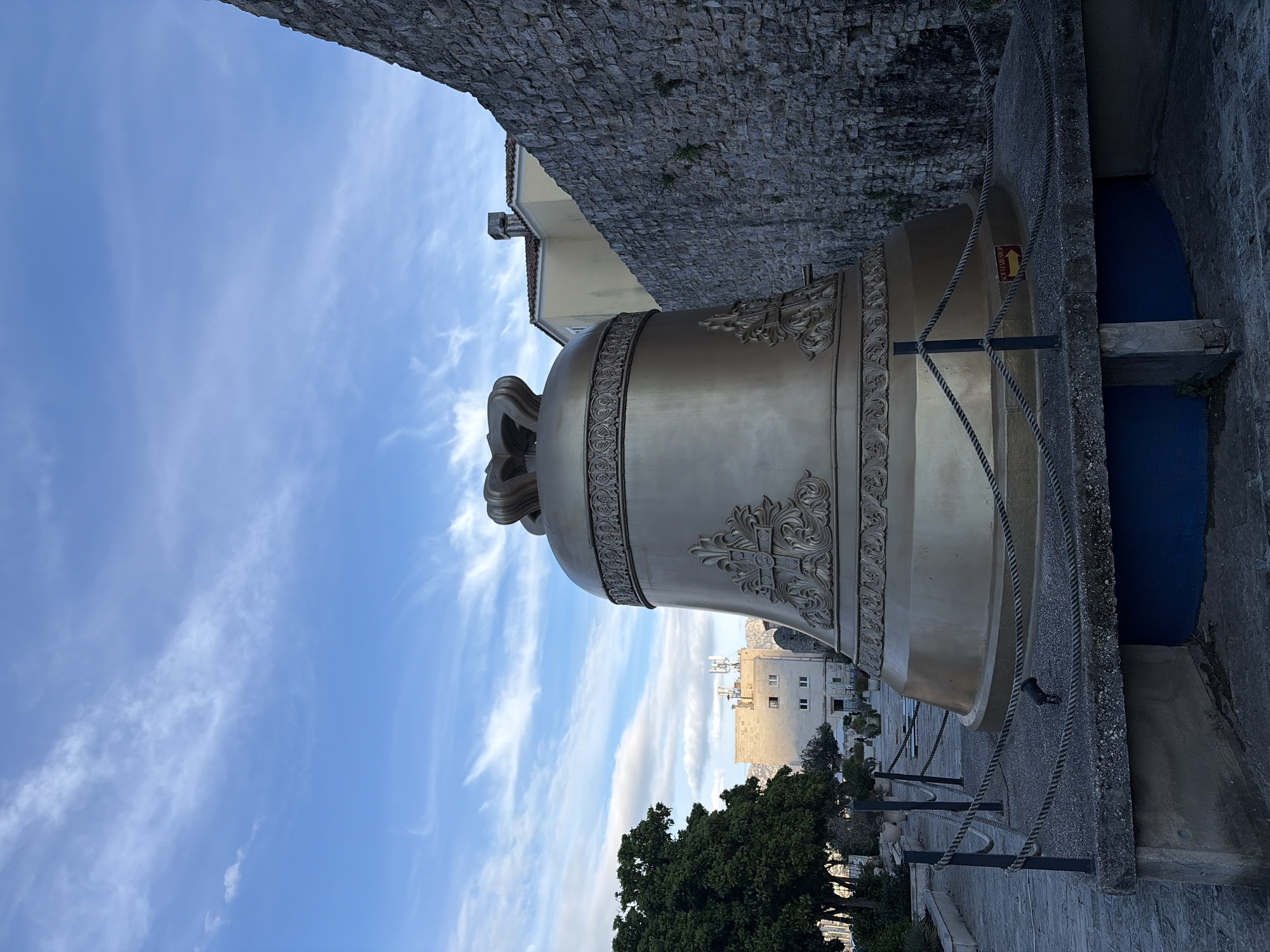 Great Bell of the Citadel in Budva, Montenegro, viewed from a low angle. The large, ornate bell is gold-colored and features decorative carvings. It is positioned near a stone wall and a blue entryway. A rope barrier runs along the base of the bell. In the background, buildings and trees are visible against a blue sky with streaky white clouds.