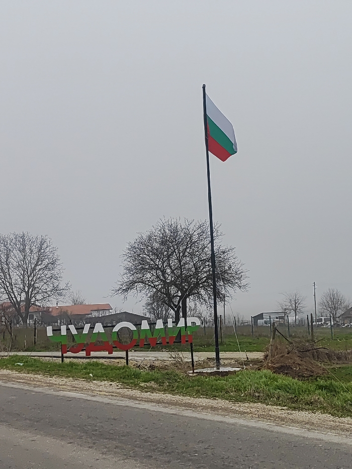 The scene depicts the entrance to the city of Chudomir, Bulgaria, under an overcast sky