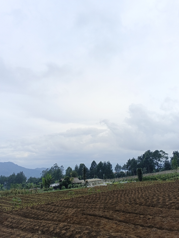 The image displays a wide agricultural landscape under an overcast sky, identified as being in São Félix do Xingu, Brazil. The upper two-thirds of the frame are dominated by a pale, cloudy sky, with some darker cloud formations visible towards the right horizon. The foreground features cultivated land with dark brown soil arranged in parallel furrows. The left portion of this field contains numerous rows of small, uniformly spaced green seedlings, indicative of young crops. The right portion of the foreground consists primarily of bare, tilled earth. Midground elements include a varied treeline composed of dark green coniferous and broadleaf trees stretching horizontally across the scene. Partially obscured by these trees and situated behind the cultivated fields are several structures. One structure on the left has a dark roof. Towards the center-right, a larger, lighter-roofed structure, possibly a building or a greenhouse, is visible amidst further agricultural development, including trellises or smaller plants. In the distant background, hazy, dark green mountains or hills recede, blending into the atmospheric conditions. No individuals, direct actions, or interactions are visible within the scene, which depicts an active but uninhabited agricultural setting.