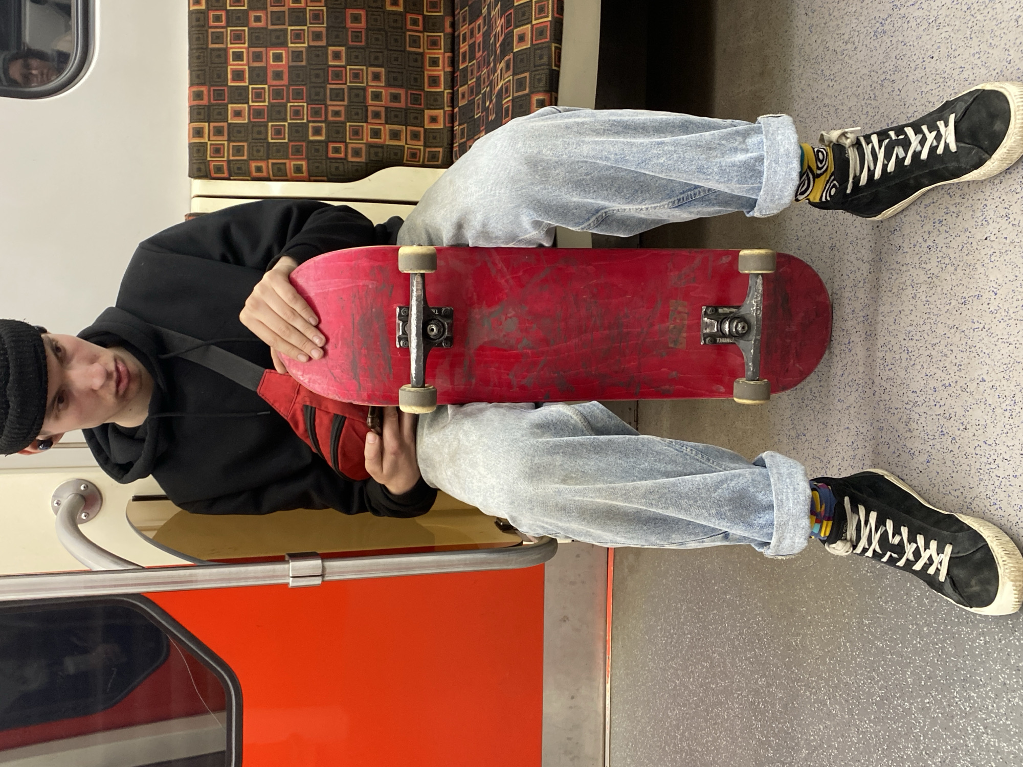 The image portrays the interior of a Saint Petersburg Metro train car. A young male, seated, occupies the central foreground. He wears a black beanie, a black hooded sweatshirt, light-wash denim jeans cuffed at the ankles, and black high-top sneakers with white laces. Distinctively patterned socks are visible above his shoes. A red fanny pack with a black strap is worn across his upper torso. He holds a heavily scuffed, red skateboard vertically between his legs, with his hands resting on the deck. A black earbud is visible in his right ear, and his gaze is directed downwards and to his right. The train's interior includes a prominent red door panel with a silver vertical handrail on the left, a light gray speckled floor, and cream-colored wall panels. A bench seat upholstered in a geometric pattern of brown, orange, and yellow squares is visible to the right of the subject. The reflection of another individual's face is faintly visible in a window in the upper right background.